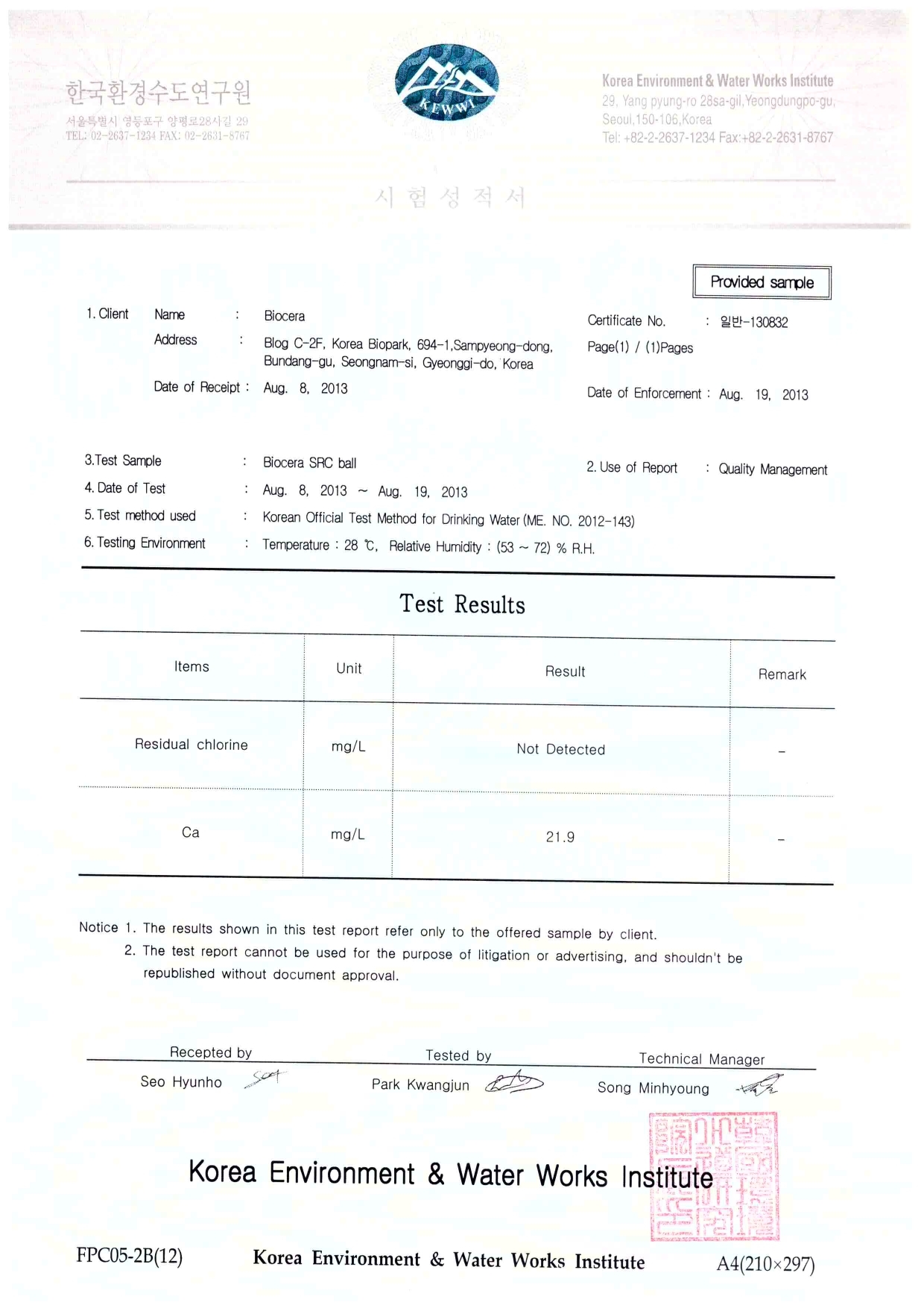 Заключение Корейского института окружающей среды и водоподготовки. Через фильтр пропутили 10,000 литров (среднее потребление семьи в течение 6 месяцев) хлорированной водопроводной воды. Хлор не обнаружен.
